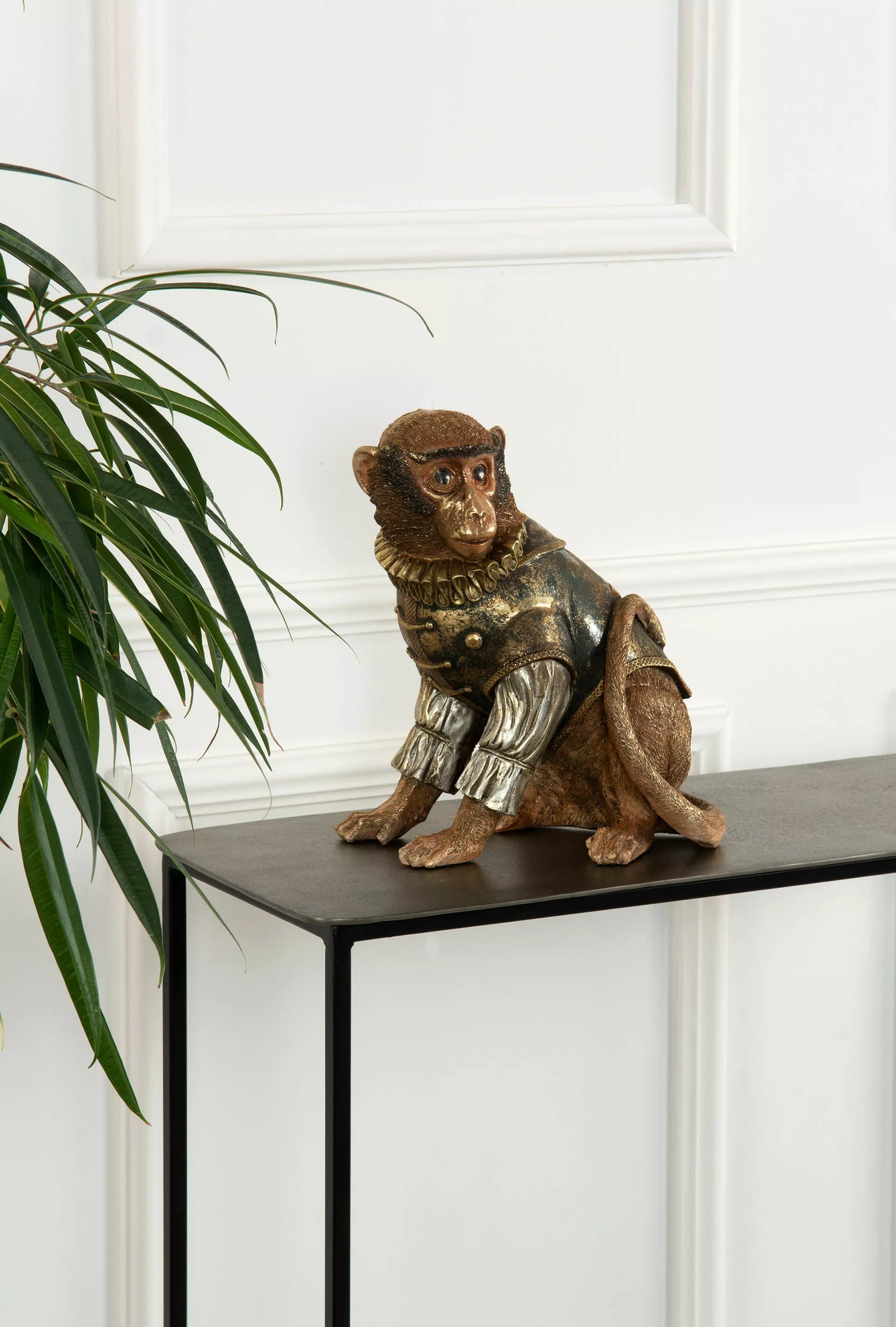 Ihastuttava istuva apina vaatteissaan. Kultaisen hohtoinen maalipinta.