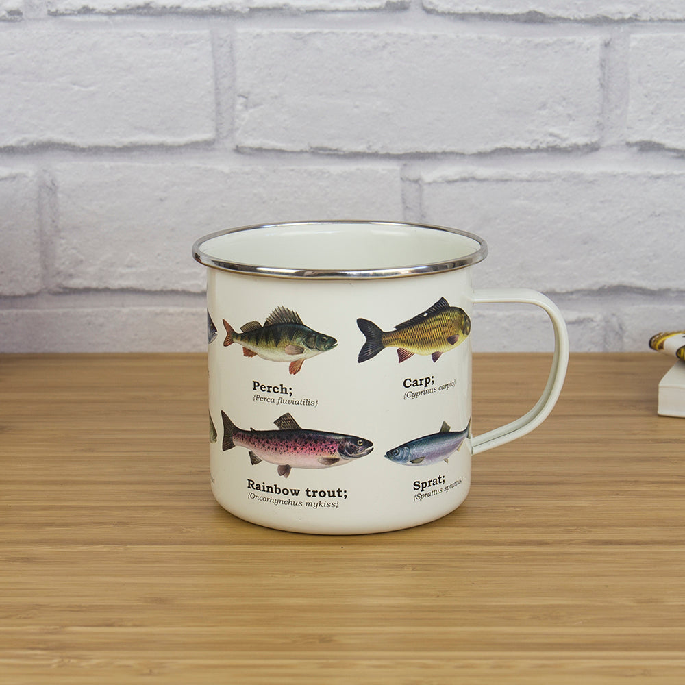 Tyylikäs ja kestävä emalimuki, jossa on kauniita kuvituksia erilaisista kaloista – pakollinen hankinta kalastuksen harrastajille tai luonnon ystäville! Täydellinen kalastusretkille, retkeilyseikkailuille tai viihtyisille hetkille kotona.