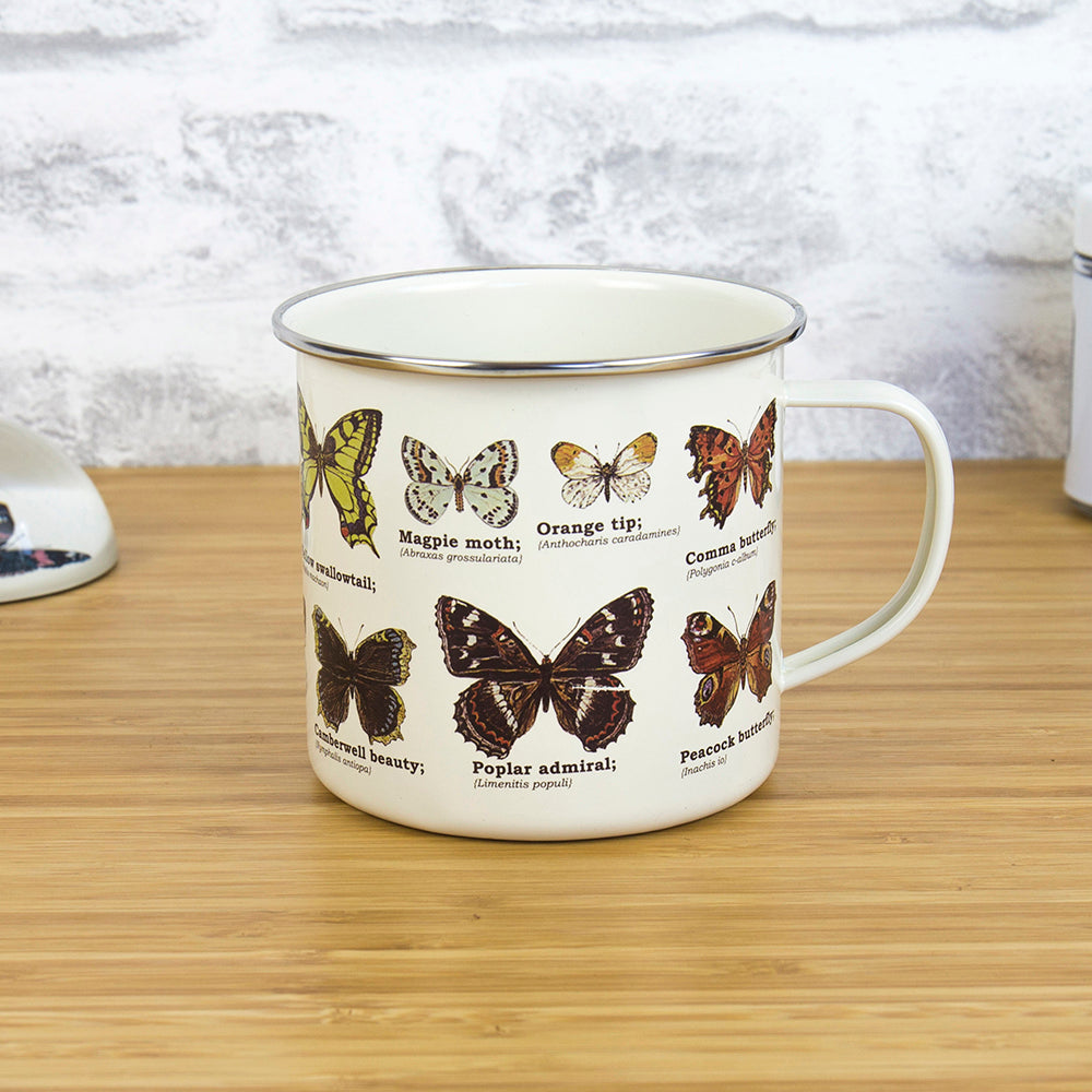 Nauti kahvistasi tai teestäsi tässä ihastuttavassa emalimukissa, jossa on upeita perhosten kuvia. tämä 500 ml:n muki on ihanteellinen aamiaiselle kotona tai seikkailuille tienpäälle.