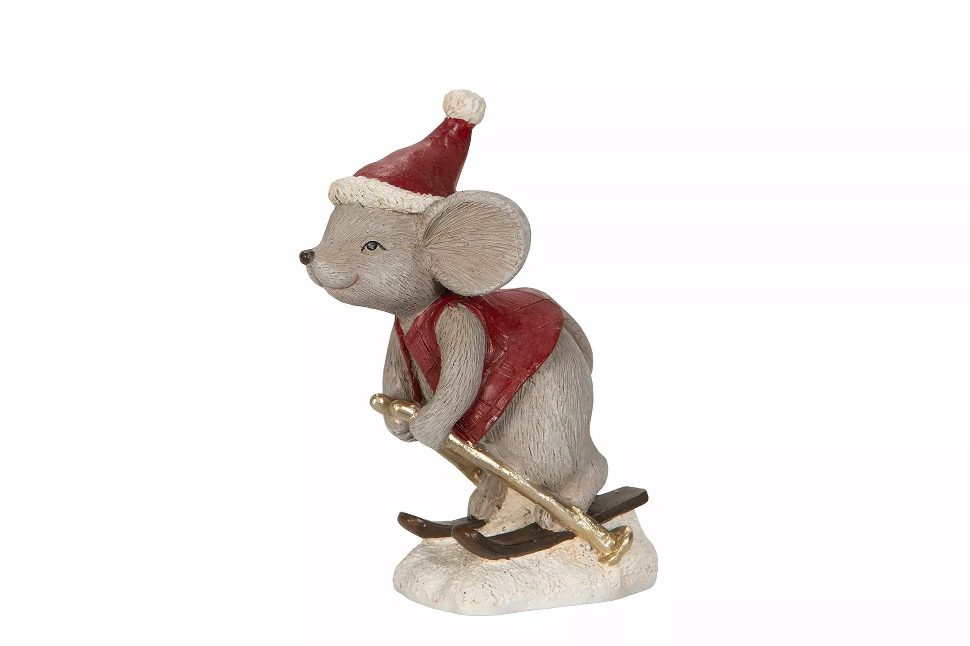 Ihana hiirulainen punaisessa vaatteessa ja tonttulakissaan. Hiiri hiihtää lumikinoksen päällä. Ihana yksityiskohta kattaukseen, asetelmiin ja tonttuovelle.