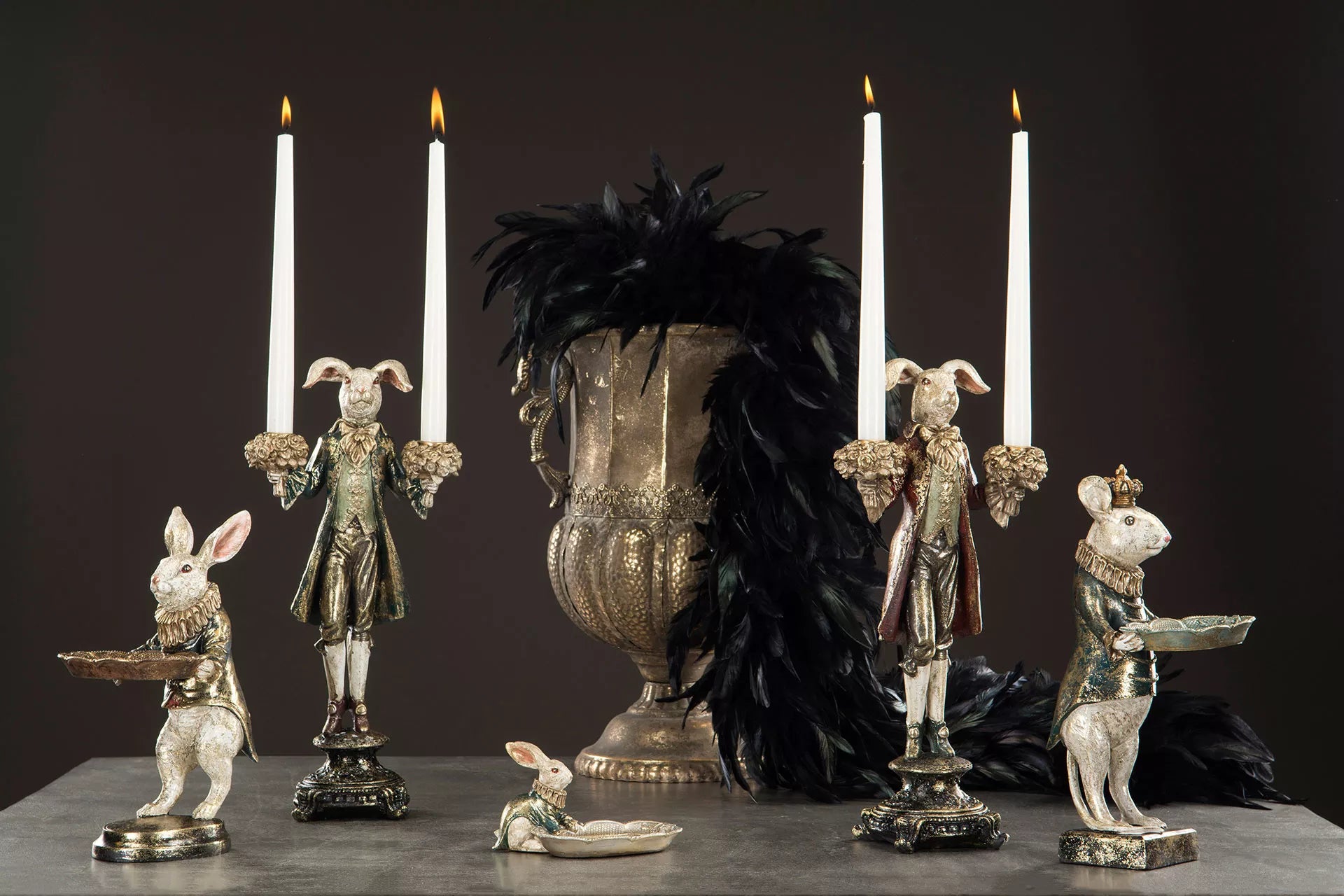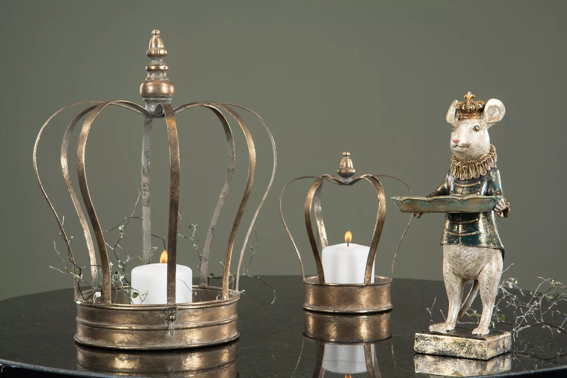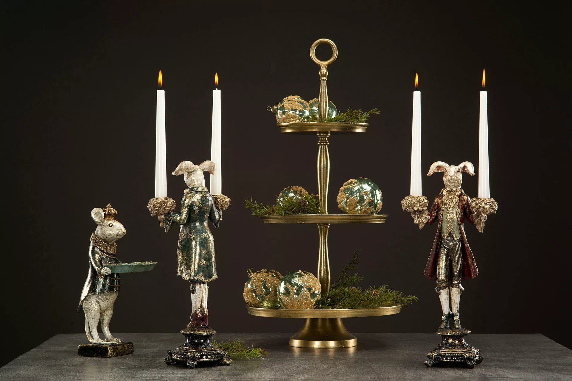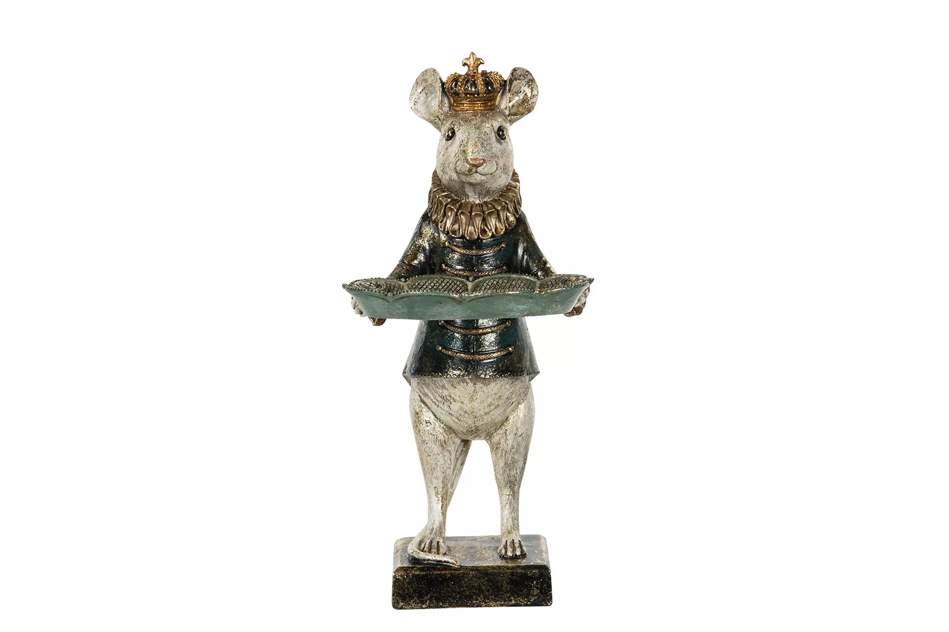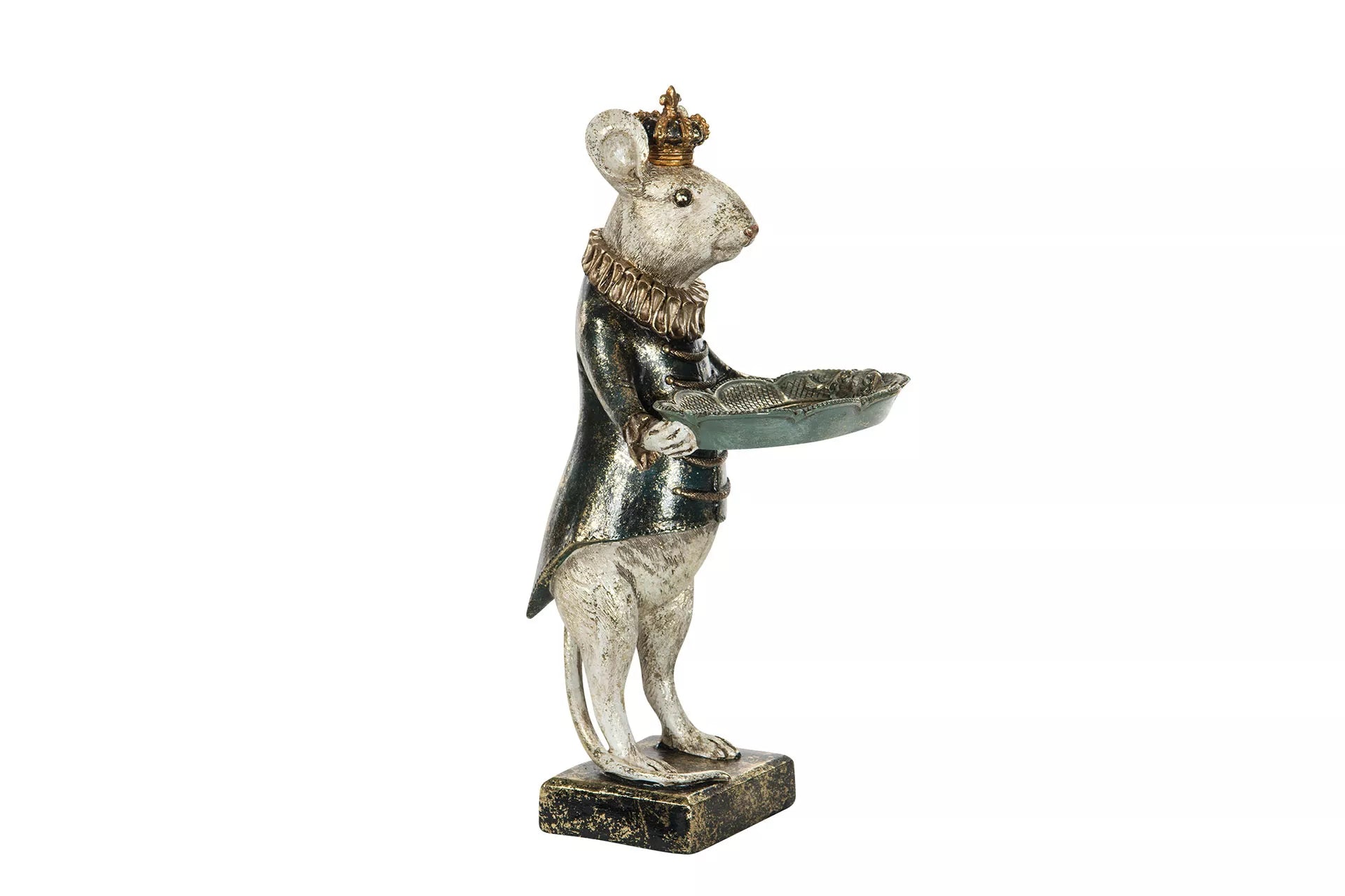 Ihana hiiri pitelee vatia koruille, avaimille ja pienille aarteille. Hiirellä on vihreä takki ja kultaisen hohtoinen maalipinta. Korkeus 32cm.