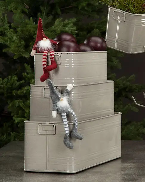 Ihana tonttu roikkuvilla jaloilla ja magneettisilla käsillä. Voit asettaa tontun roikkumaan. Tontulla huopainen lakki, neulotut raidalliset housut, karvainen parta ja puinen nenä. T