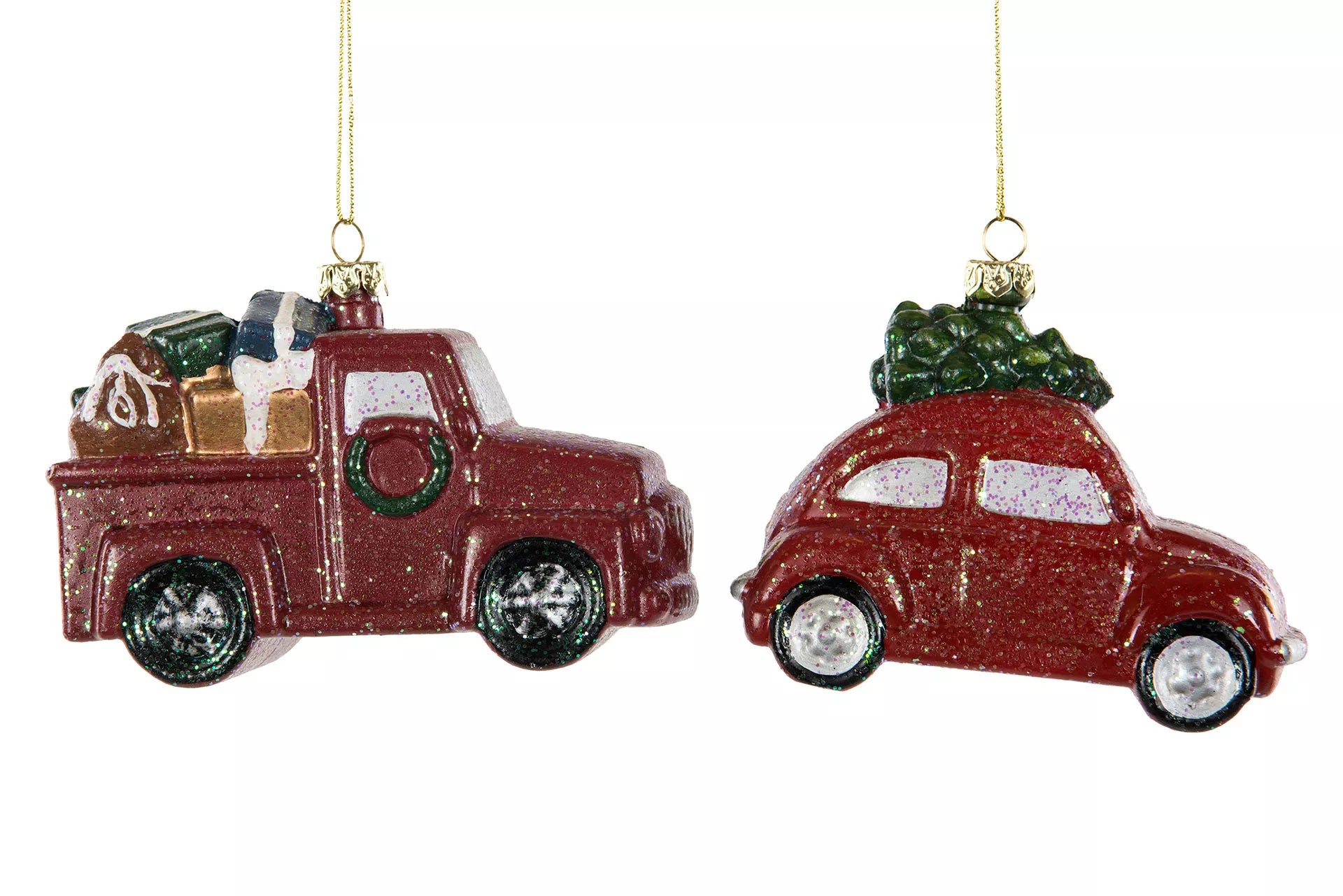 Roikkuva joulukoriste tai kuusenkoriste auto. Symppis söpöläinen itselle tai lahjaksi. Auto on punainen ja ripustusnauha kultainen.