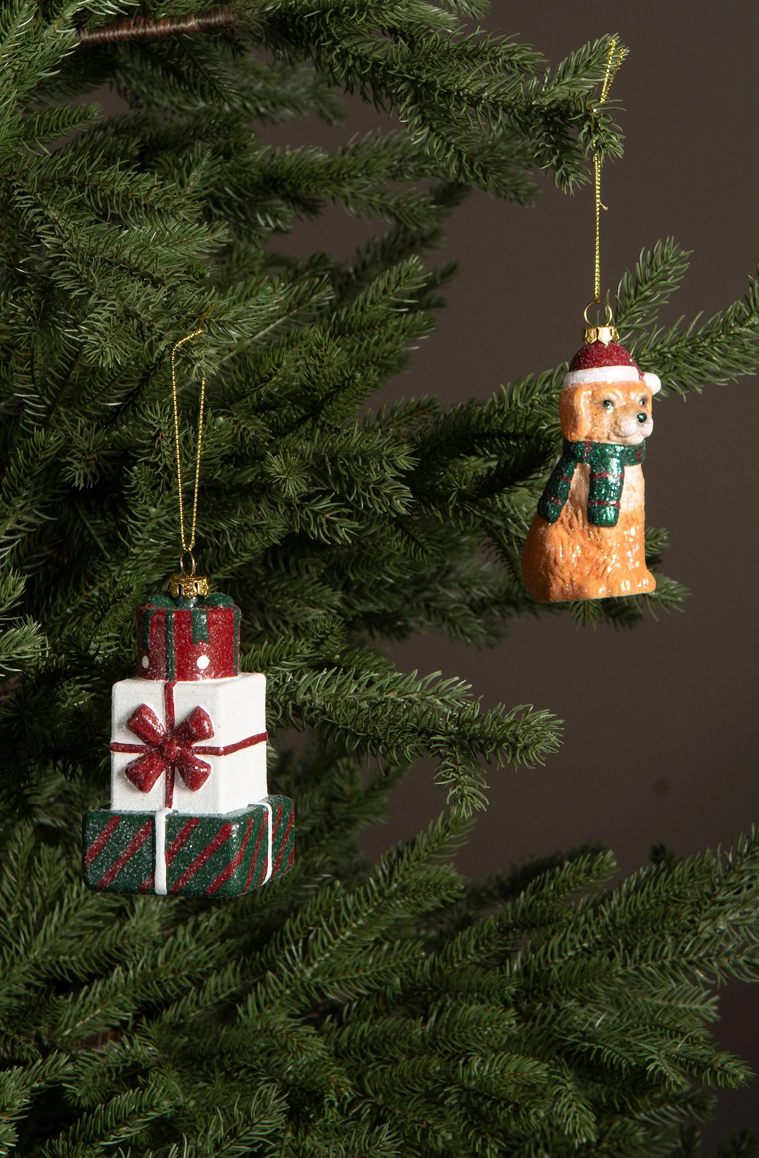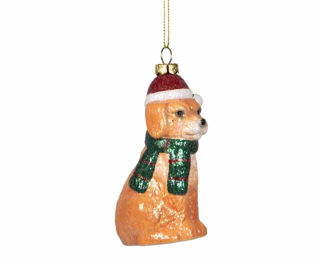 Koristele joulukuusi leikkisästi söpöllä koiralla, jolla on hattu ja huivi. Ripustusnauha kultainen.