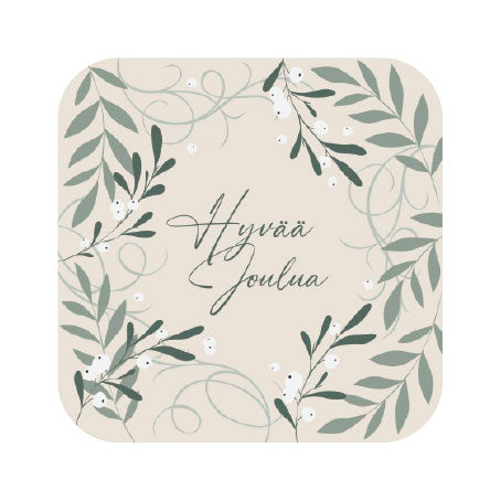 Vaalealla pohjalla tummanvihreitä kasveja ja köynnöstä seka valkoiset marjat. Keskellä teksti ''Hyvää Joulua''. Tyylikäs kortti.