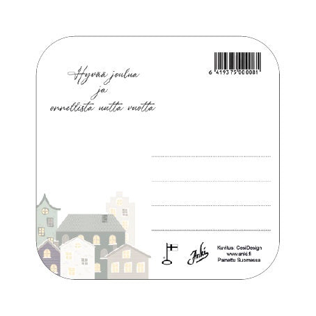 Taustapuolella on printattuna kortin etupuolen kuva-aihetta läpikuultavasti, osoiterivit sekä ''Hyvää joulua onnellista uutta vuotta'' -teksti.