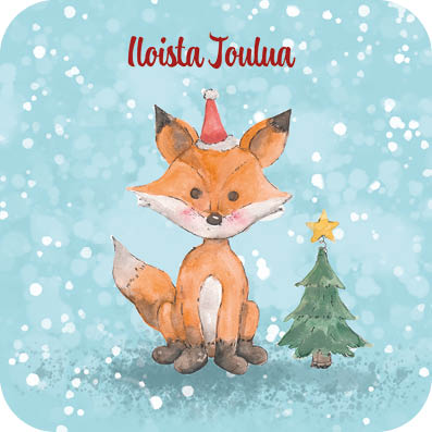 Kettu tonttulakissa sinisellä taustalla. Joulukuusi, lumisadetta ja punaisella tekstillä ''Iloista joulua''. Kaunis ja herkkä vesivärin tunnelma.