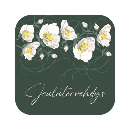 Valkoiset kukat tumman vihreällä pohjalla ja teksti ''Joulutervehdys''. Tyylikäs kortti.