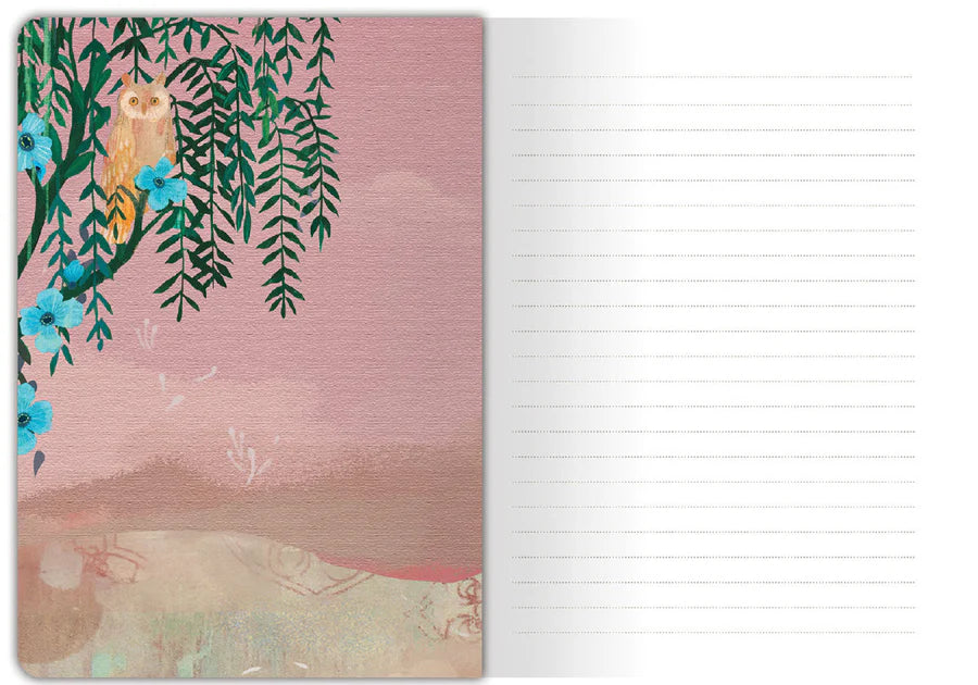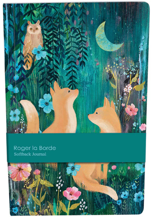 Ihana muistikirja, taianomaisella kuutamokuvituksella. Kaksi kettua kukkaniityllä, pöllö ja kuu. Värillinen taideteoskuvitus myös ensimmäisellä sivulla, sisäkannessa. Upeita värikkäitä yksityiskohtia. Muistikirjassa on vuorotellen viivoittettuja ja tyhjiä sivuja. Kansi on teksturoitu ylellisesti