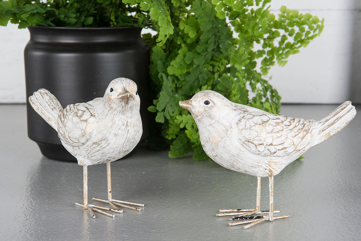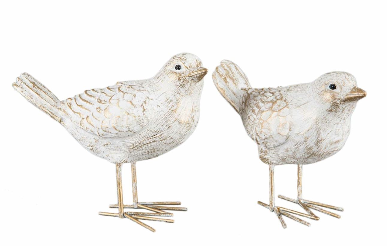 Valkoinen patinoitunut pikkulintu koristeeksi asetelmiin ja kattaukseen. Linnun jalat on metallia.
