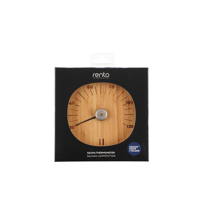 Yksinkertaistettu bambuinen saunan lämpömittari celsiusasteilla. Bambu on kaunis materiaali, joka sointuu hyvin yhteen suomalaisten laudepuulajien kanssa ja miellyttää silmää luonnollisuudellaan. Design from Finland sertifioitu tuote. Suunniteltu Suomessa.