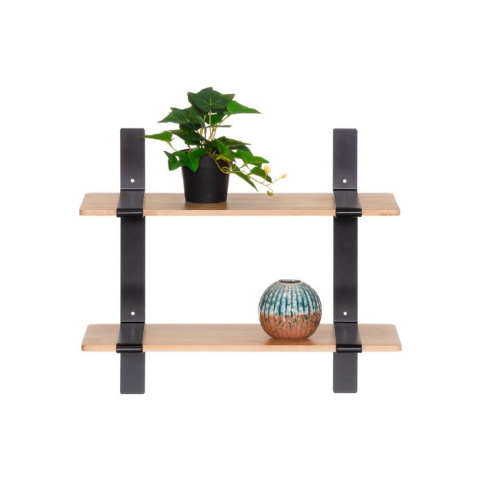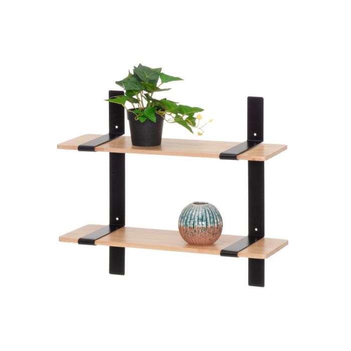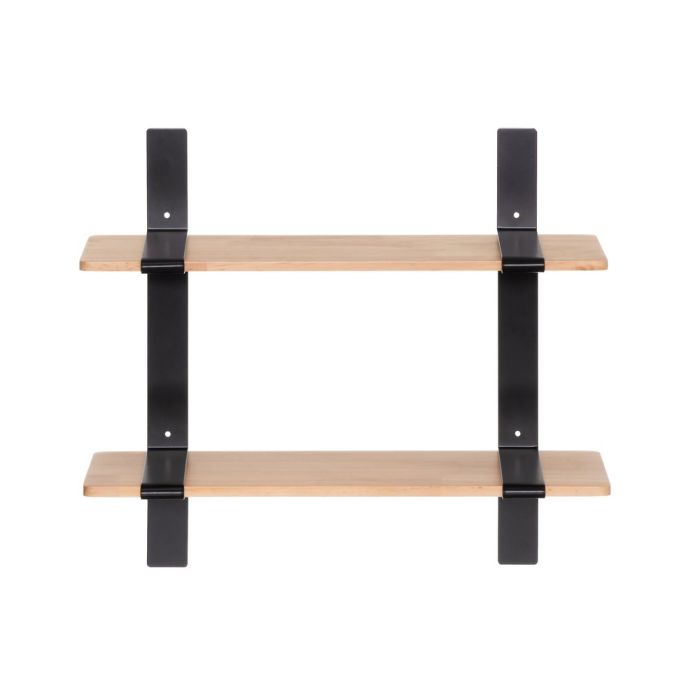 Seinähylly. Mustat metalliset kannakkeet ja puiset hyllylevyt.