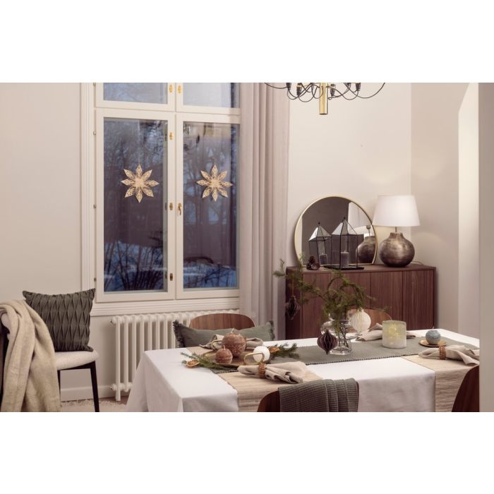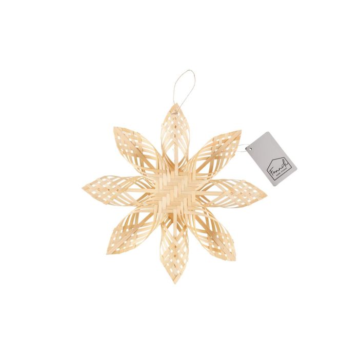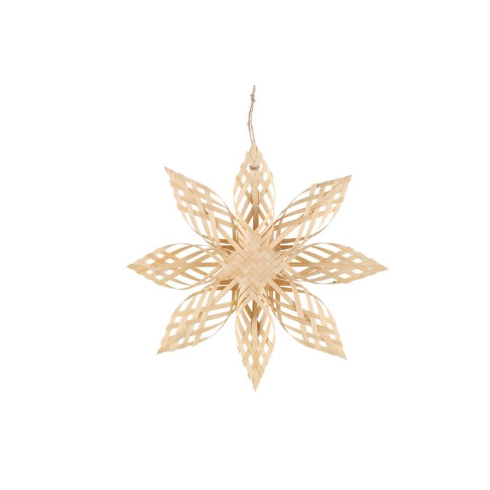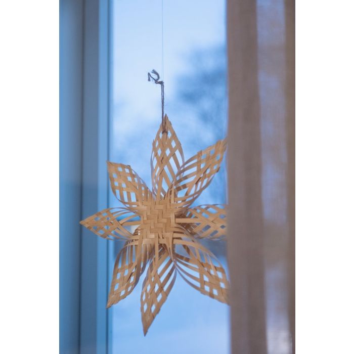 Bambusta ja palmusta valmistettu kaunis tähtikoriste. Juuttinarusta ripustusnauha.
