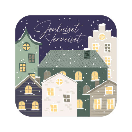 Talvinen talomaisema ja teksti ''jouluiset terveiset''