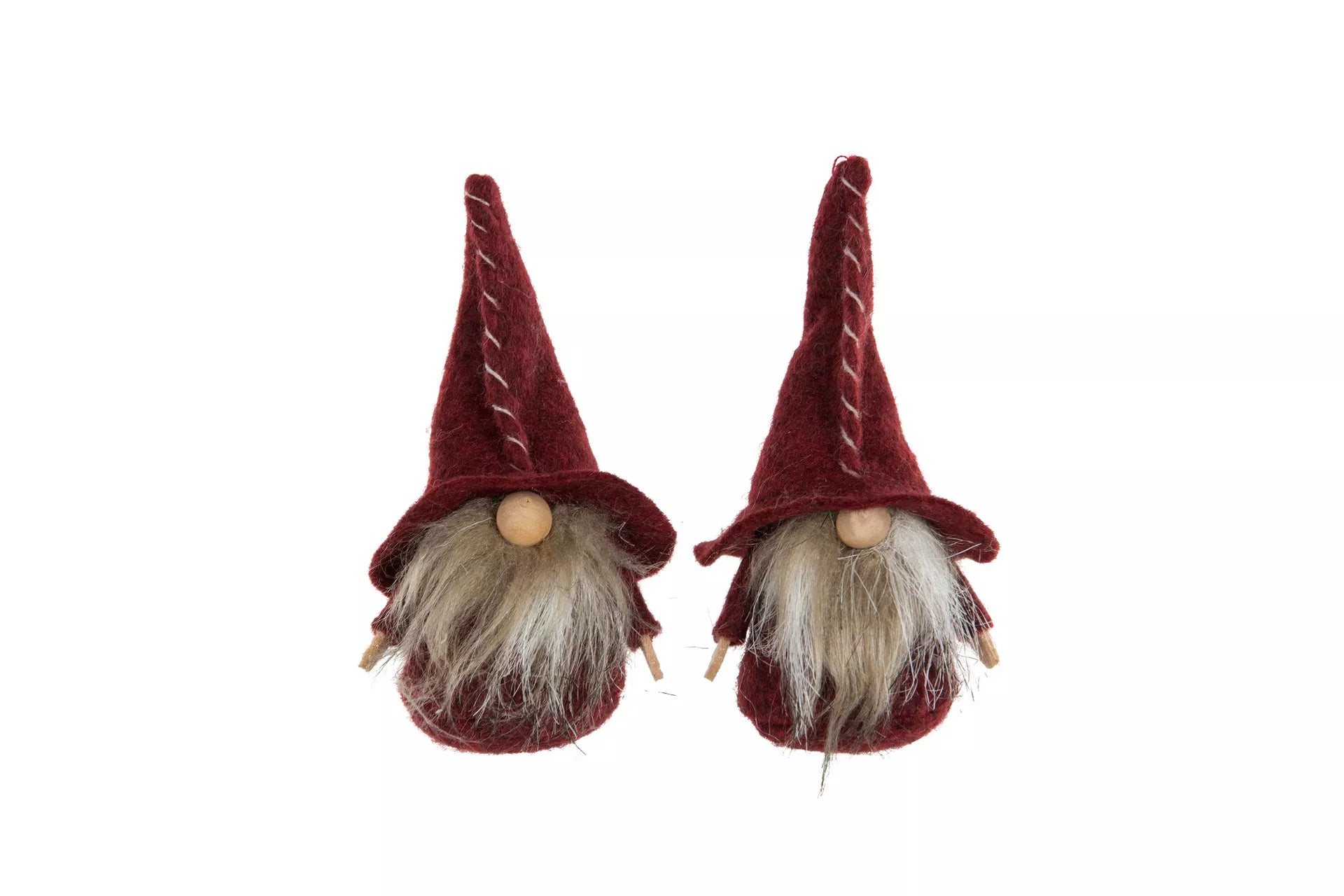 Söpö pieni tonttu. Viininpunainen takki ja lakki. Karvainen parta ja puinen nenä.