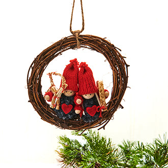 Ihanat tonttukaverukset istuskelee kranssilla, olkipukkien kera. Tontuilla on punaiset lakit ja sydänkuvioiset takit. Luonnolliseen ja perinteiseen jouluun. Itselle tai lahjaksi.