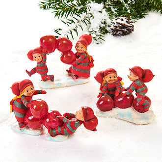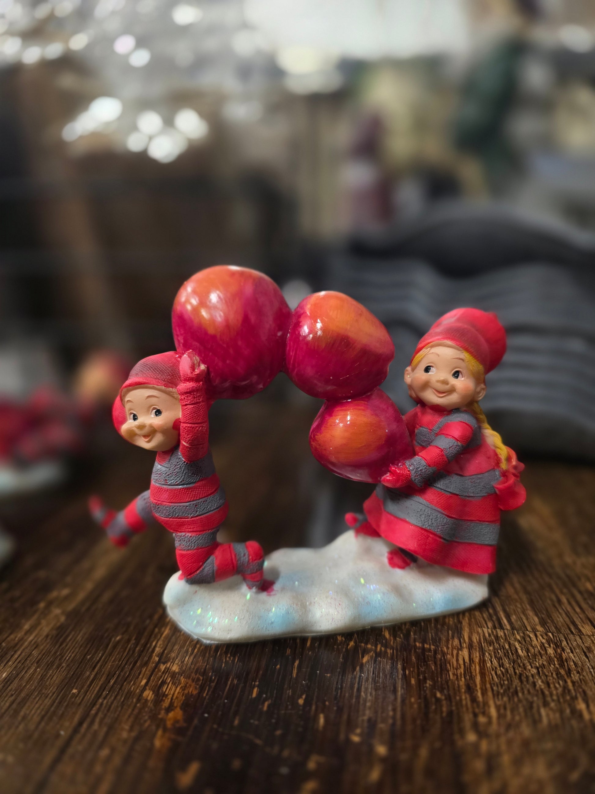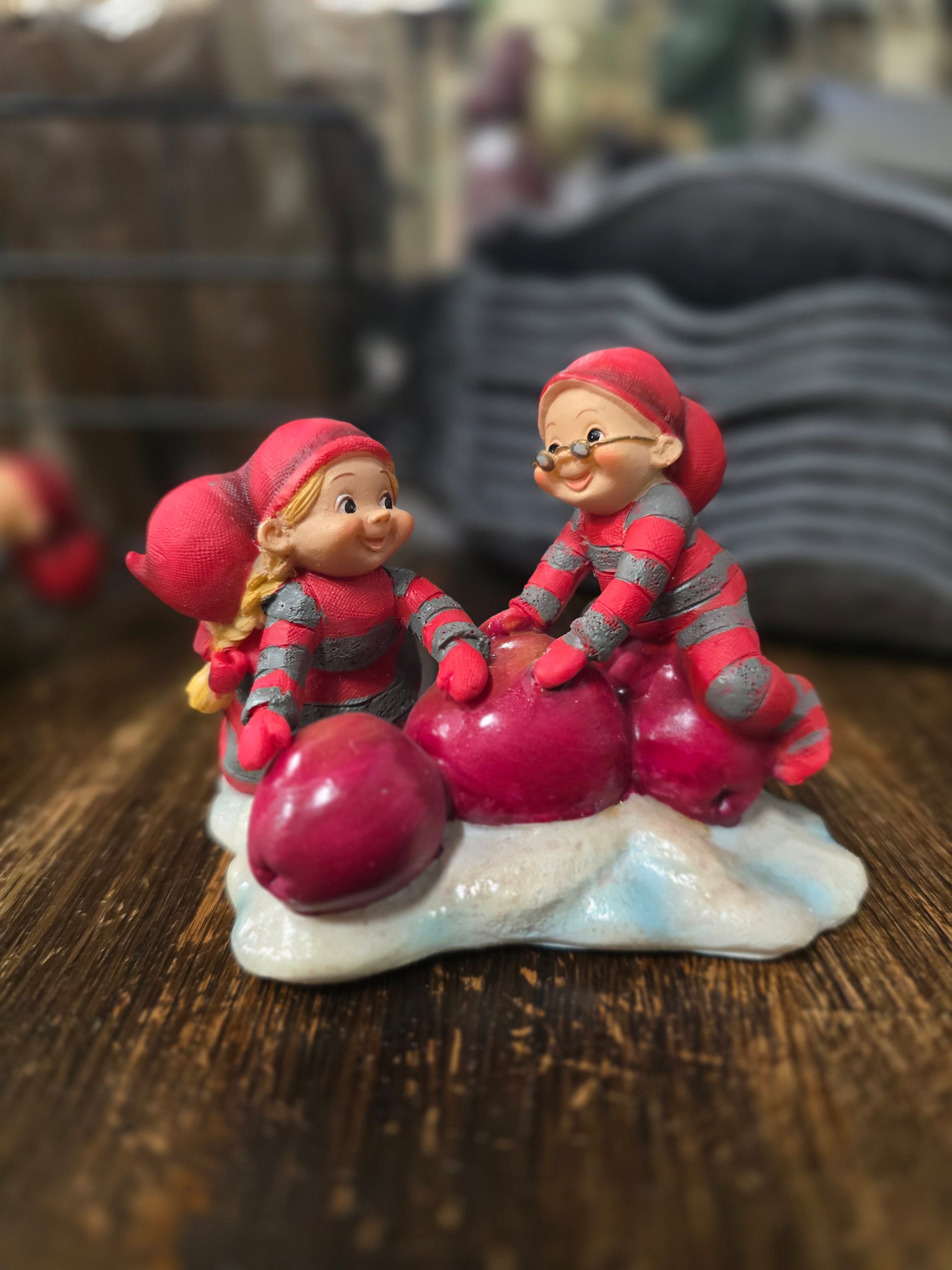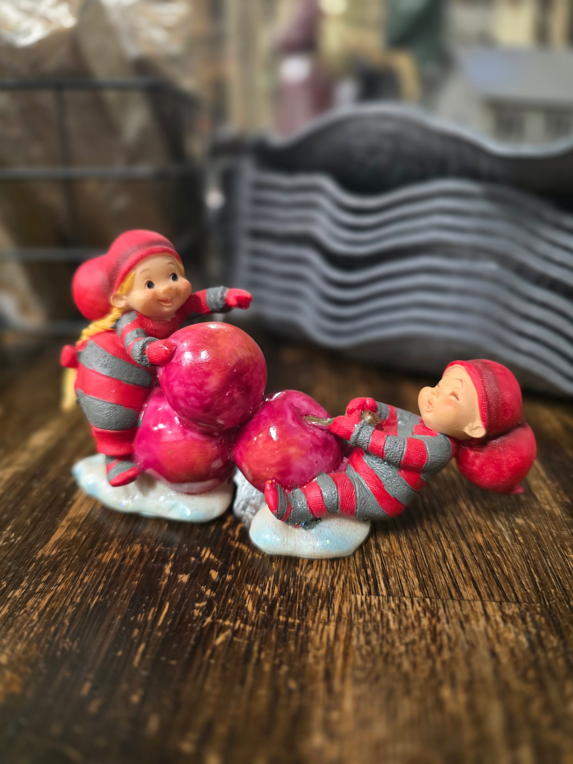 Valikoimassa 3 erilaista tonttukaksikkoa jouluomenan kanssa.